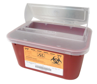 Heavy-duty, one-piece polypropylene sharps containers are puncture and leak resistant. Containers provide safe disposal of syringes, needles, and other infectious waste. A safety handle provides arms-length protection, and a see-through, one-way entry prevents overfilling.